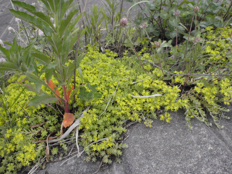 一方、コンクリートの上では、セダムのツルマンネングサSedum sarmentosumが
