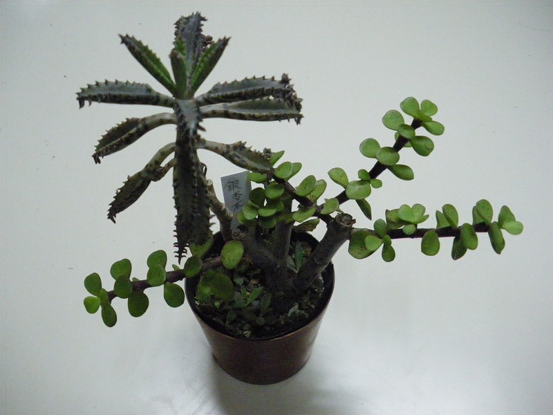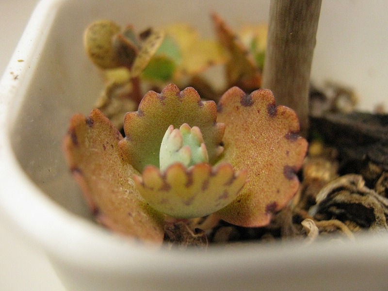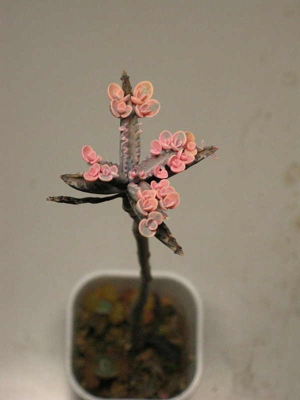 こちらは鮮やかな芽が美しい不死鳥錦。著しく徒長した挙句、50円で投げ売りされていたもの。