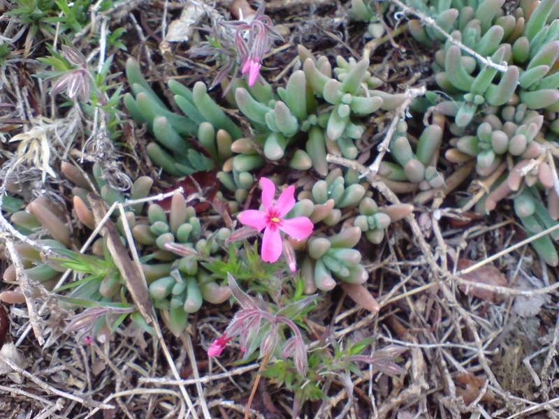 シバザクラの花と、メセンの葉。